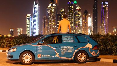 Dalam perjalanannya, dia mengendarai mobil station wagon-nya yang dijuluki "The Blue Bandit". Dia menyebut pencapaiannya sebagai perjalanan terpanjang di dunia dengan menggunakan mobil listrik. (WIEBE WAKKER / PLUG ME IN PROJECT / via REUTERS)