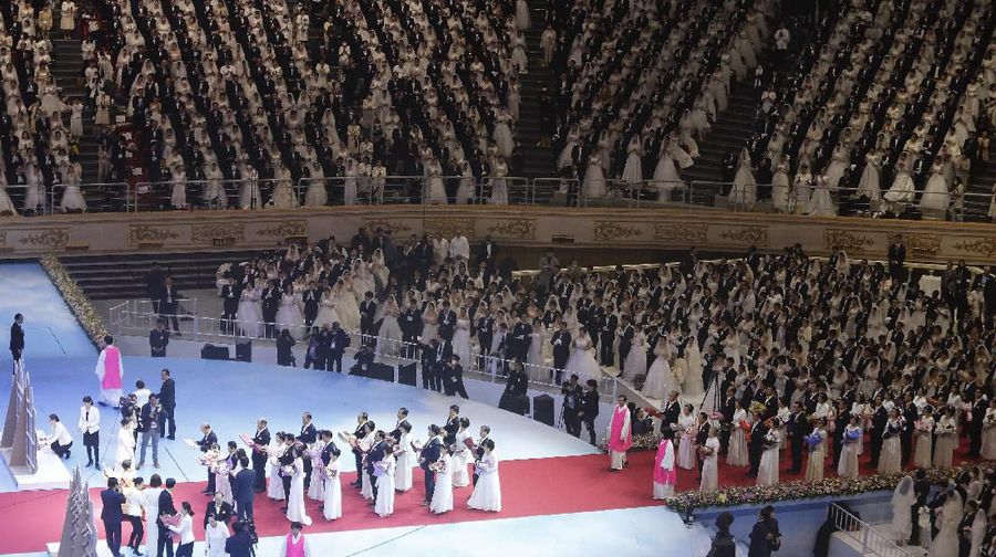 Gereja Unifikasi, yang didirikan pada tahun 1954, secara teratur mengadakan upacara pernikahan massal untuk para pengikutnya di seluruh dunia. (AP Photo/Ahn Young-joon)