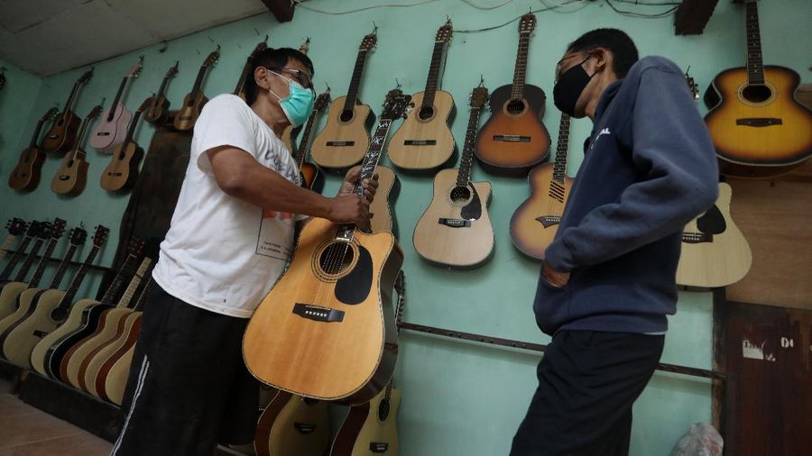 Pengrajin memperbaiki gitar pelanggan di Servis Gitar Pak Manto, Jakarta Selatan, Senin (8/2/2021). Selain mereparasi gitar, Manto juga memproduksi gitar akustik yang dijual dari harga ratusan ribu hingga jutaan rupiah, tergantung jenis dan tingkat kesulitannya. (CNBC Indonesia/Andrean Kristianto)