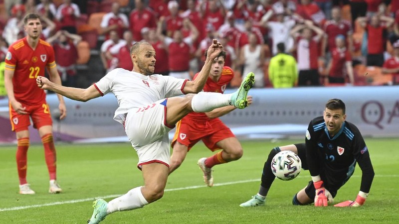 Denmark berhasil lolos ke 8 besar usai mengalahkan Wales dengan skor 4-0. (AP Photo/Peter Dejong, Pool)