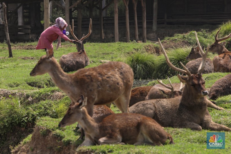 Seekor rusa berdiri saat para wisatawan ramai mengungjung objek wisata Kampung Cai Ranca Upas di kecamatan Rancabali, Bandung Selatan, Jawa Barat. Sejumlah destinasi tempat wisata di Bandung Selatan sudah mulai dibuka dengan penerapan protokol kesehatan yang ketat. (CNBC Indonesia/ Andrean Kriatianto)