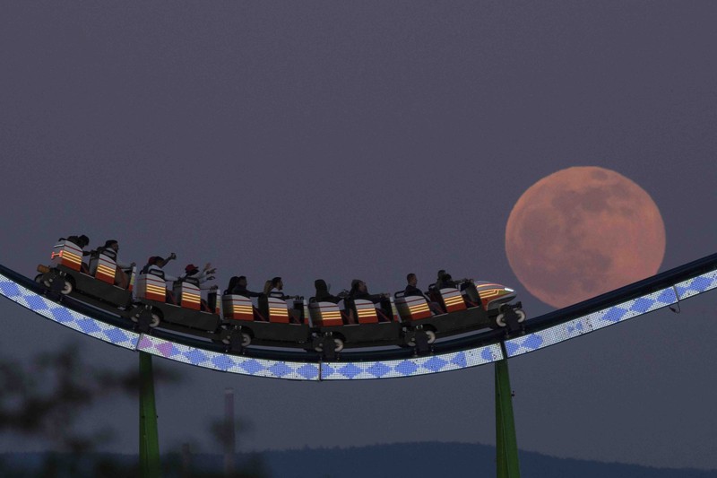 Bulan terbit di belakang Alpina Bahn di Dippemess Frankfurt, pekan raya tradisional Jerman, Sabtu, 16 April 2022. Fenomena bulan merah jambu atau pink moon menghiasi langit Jerman. (Sebastian Gollnow/dpa via AP)