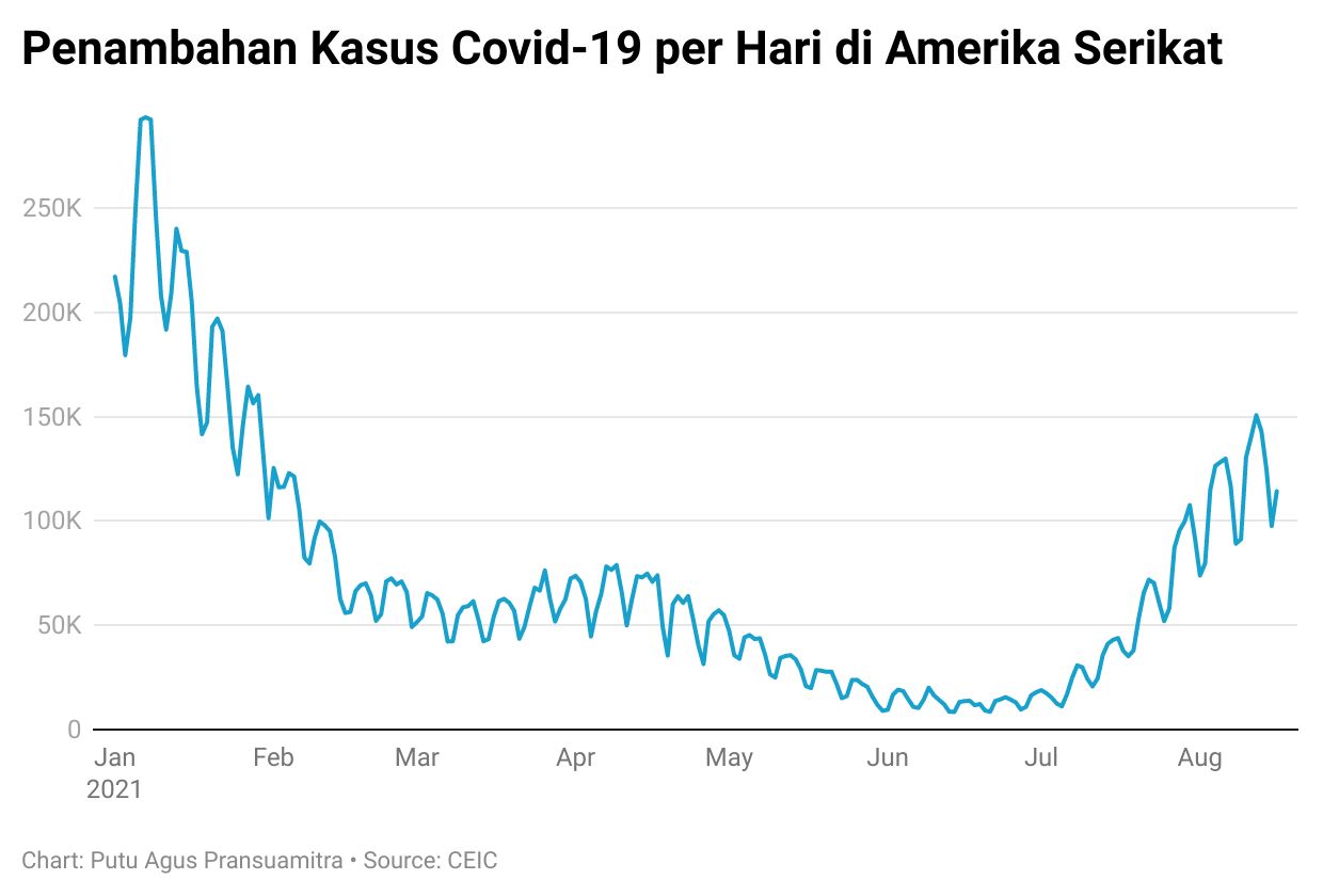 Rata-rata kasus dalam 7 hari hingga awal pekan ini sebanyak 133.068 kasus dari total penduduk AS, menjadi yang tertinggi sejak 3 Februari lalu. Jika dilihat dari rata-rata pertengahan Juni lalu sekitar 12.000 kasus, artinya mengalami kenaikan sekitar 1000%.
