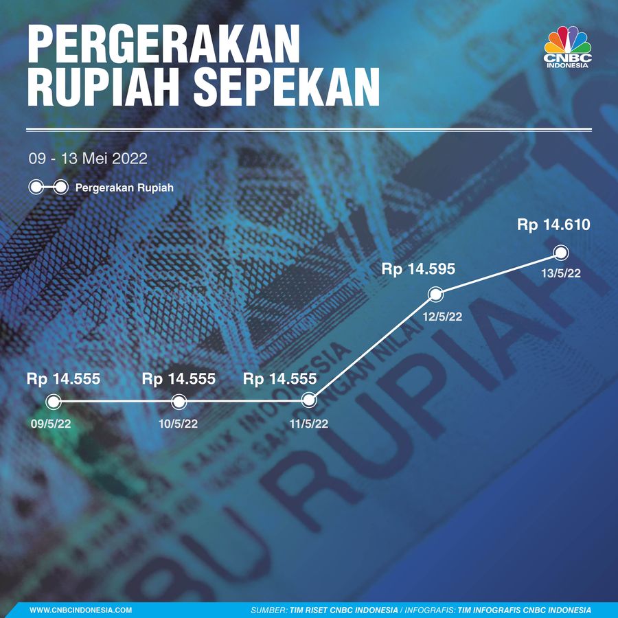 Menurut data Refinitiv, di penutupan perdagangan Jumat (13/5/2022), rupiah turun 0,10%, berada di Rp 14.610/US$ di pasar spot. Dalam sepekan, mata uang Garuda melemah 0,79%.