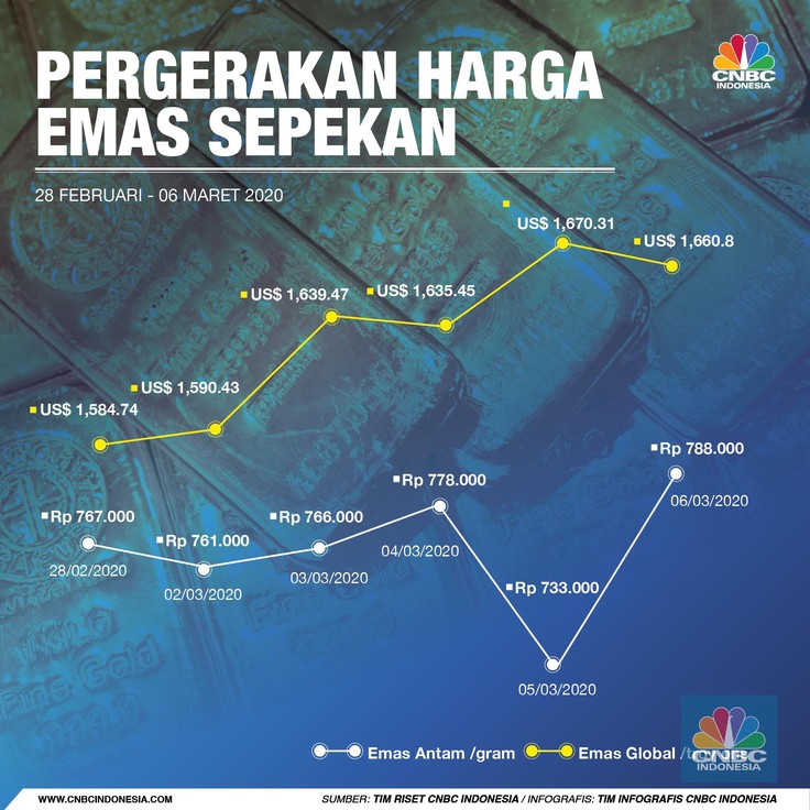 Sepanjang minggu ini, harga emas dunia di pasar spot naik 4,79%. Harga komoditas ini kembali menembus kisaran US$ 1.600/troy ons.