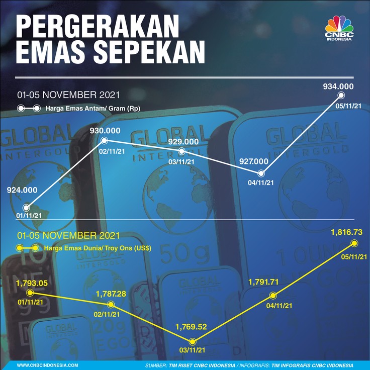 Jumat kemarin, emas dengan berat 1 gram dijual Rp 934.000/batang, secara persentase melesat 0,76%. Harga jual tersebut belum termasuk pajak 0,9% bagi pembelian tanpa menggunakan Nomor Pokok Wajib Pajak (NPWP), dan 0,45% dengan NPWP.