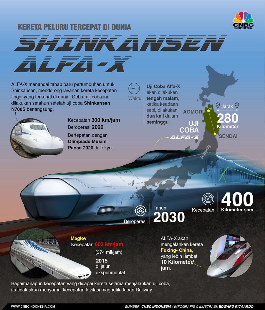 Begini Wujud Shinkansen ALFA-X, Kereta Tercepat di Dunia Comment SHARE url telah tercopy Edward Ricardo, CNBC Indonesia 13 May 2019 20:09 Jakarta, CNBC Indonesia- Jepang mulai uji coba kereta Shinkansen ALFA-X yang memiliki daya tempuh 400 km/jam, kereta tercepat di dunia. Uji coba dilakukan mulai tahun ini dan kereta akan beroperasi mulai 2030