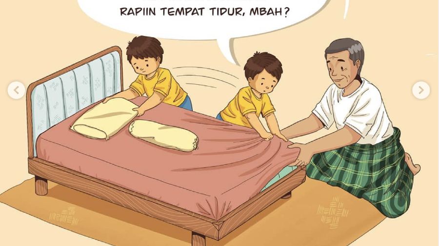 Si bocah pun diminta merapikan tempat tidurnya. Ia lantas bertanya apa hubungannya merapikan tempat tidur sendiri dengan menjadi presiden mbah? Si mbah menjawab dengan mengatakan kalau punya cita-cita besar harus dimulai dari hal-hal kecil. (Instagram Jokowi @jokowi).