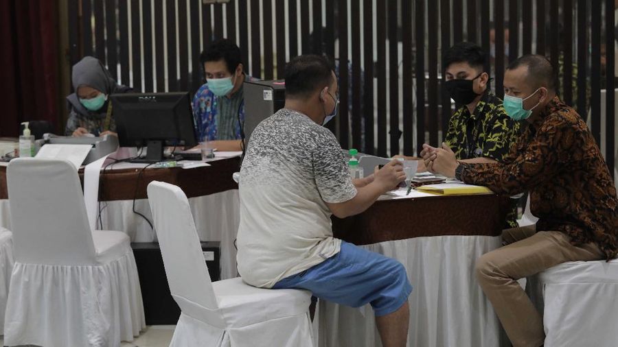 Semenjak Covid-19 mewabah, pelayanan pegadaian di tempat itu dipindah sementara ke aula untuk menerapkan jaga jarak dengan orang lain. (CNBC Indonesia/Muhammad Sabki)