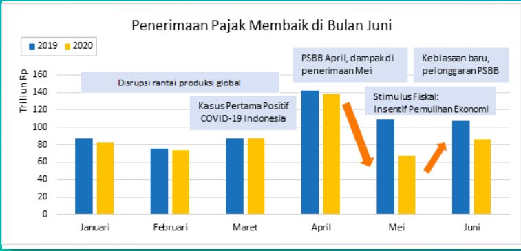 "Kinerja Penerimaan Pajak menunjukkan perbaikan pada bulan Juni seiring mulai dilonggarkannya Pembatasan Sosial Berskala Besar (PSBB) dan dimulainya fase Adaptasi Kebiasaan Baru, serta mulai membaiknya ekonomi negara-negara mitra dagang utama Indonesia secara umum," tulis dokumen APBN Kita Edisi Juli 2020.