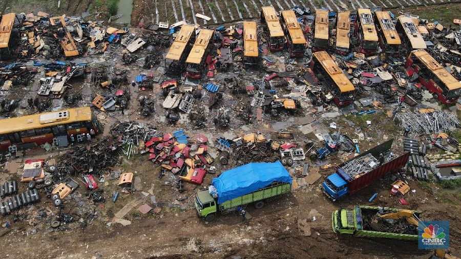 Nantinya potongan bus-bus tersebut akan dibawa ke sebuah daerah di Bekasi untuk dilebur. (CNBC Indonesia/Andrean Kristianto)