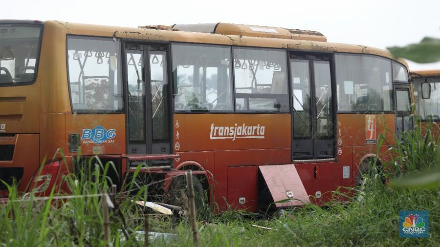 Suasana bus Transjakarta yang mangkrak hasil tender 2013 di sebuah lahan kosong di Desa Dramaga, Kecamatan Dramaga, Kabupaten Bogor, Jawa Barat, Rabu (4/11/2020). (CNBC Indonesia/Andrean Kristianto)