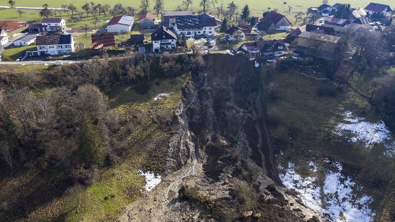 Hujan dan cuaca yang buruk juga membuat sejumlah wilayah di Jerman di sebuah lereng longsor, beberapa warga dievakuasi dari rumah mereka di Wangen, Jerman, Jumat, 5 Februari 2021. (Daniel Kopatsch / dpa via AP)