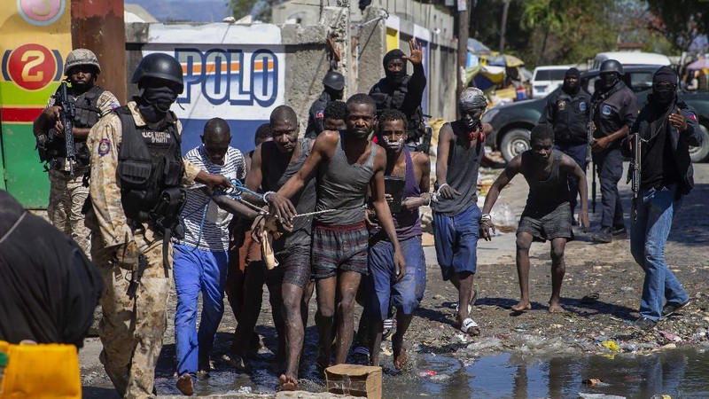 Korban tewas tergeletak di luar penjara dan beberapa napi yang ditangkap kembali dikawal oleh petugas bersenjata. (AP Photo/Dieu Nalio Chery).