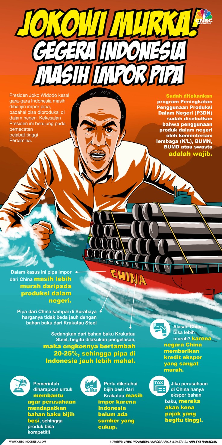 Jakarta, CNBC Indonesia - Presiden Joko Widodo (Jokowi) kesal gara-gara Indonesia masih dibanjiri impor pipa, padahal bisa diproduksi di dalam negeri. Kekesalan Jokowi ini berujung pada pemecatan pejabat tinggi PT Pertamina (Persero).