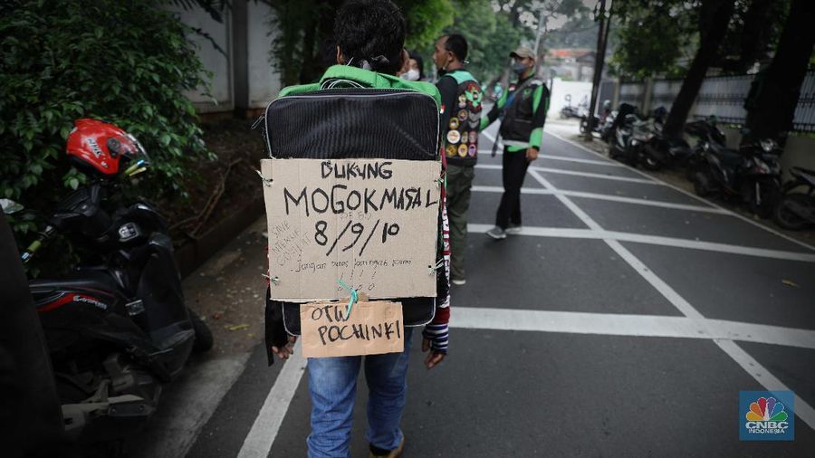 Sejumlah mitra GoTo untuk layanan GoKilat atau GoSend Same Day Delivery (SMD) melakukan aksi mogok kerja dengan cara off bid secara massal di kawasan Kemang, Selasa, (8/6/2021). (CNBC Indonesia/ Muhammad Sabki)