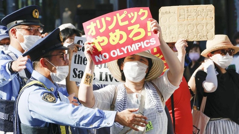 Sekelompok masyarakat Jepang menentang penyelenggaraan Olimpiade di tengah pandemi Covid-19. Jepang telah berjuang untuk mengendalikan kasus baru dan Tokyo tetap dalam keadaan darurat karena Covid-19. (Kyodo News/Kenzaburo Fukuhara via AP)