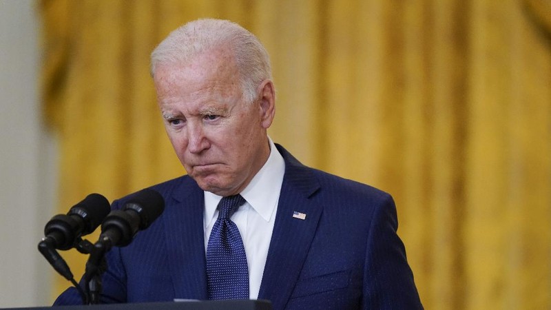 Joe Biden menyebut prajurit Amerika Serikat yang terbunuh karena serangan bom bunuh diri 'pahlawan'. Misi evakuasi di Bandara Kabul tetap akan berlanjut hingga 31 Agustus. (AP Photo/Evan Vucci)