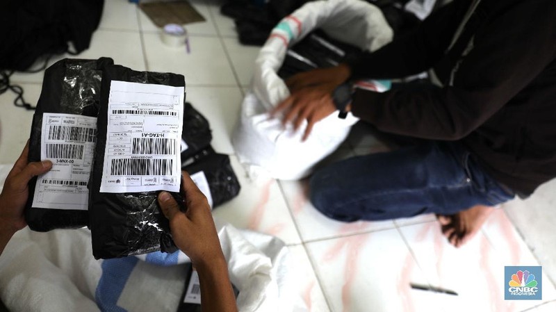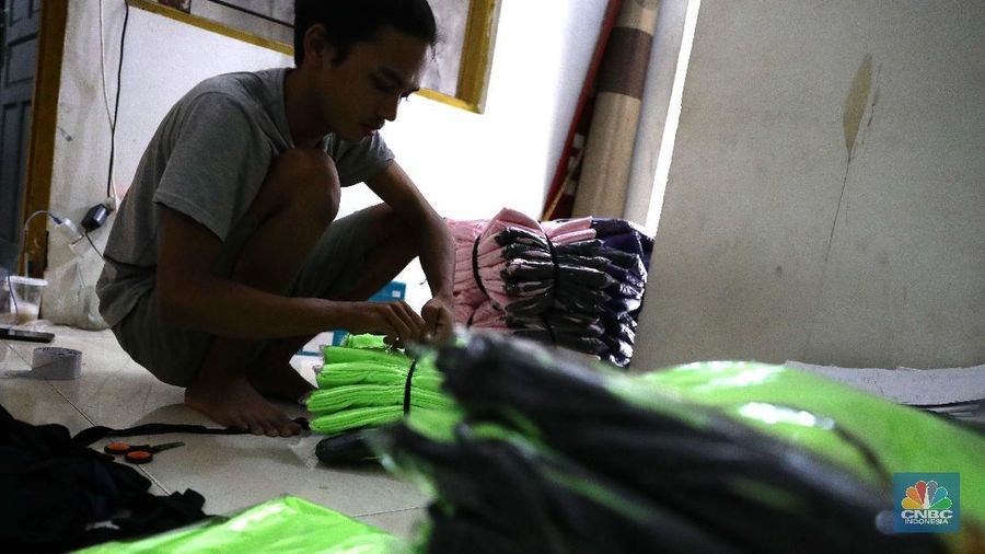 Pekerja mengikat barang di workshop produksi baju olahraga di Tengerang Selatan, Senin (6/9/2021). CNBC Indonesia/Muhammad Sabki)