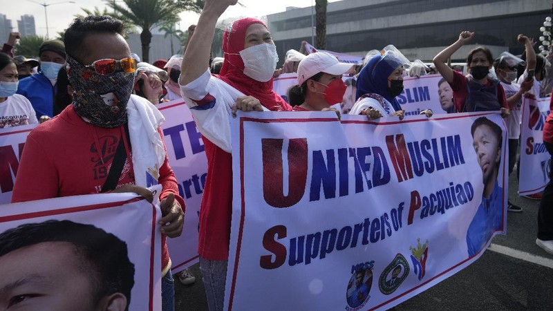 Pendukung berkumpul membentangkan banner menyambut kedatangan Manny Pacqiao di Komisi Pemilihan Umum Filipina. Senator sekaligus mantan petinju Manny Pacquiao resmi mendaftar sebagai calon presiden pada Jumat (1/10) kemarin di Manila untuk Pemilu Filipina 2022. (AP Photo/Aaron Favila)