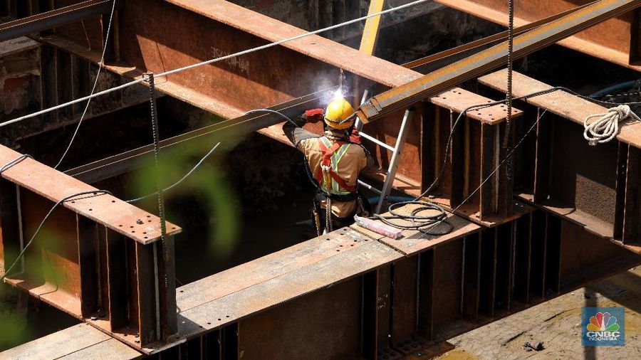 Pekerja menyelesaikan pengerjaan pembangunan proyek MRT Fase II CP 201 di kawasan M.H. Thamrin, Jakarta, Rabu (1/12/2021). (CNBC Indonesia/Andrean Kristianto)