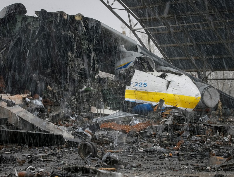 Pesawat terbesar di dunia AN-225 Mriya yang dibuat Ukraina telah hancur oleh serangan Rusia di lapangan terbang dekat Keiv. Serangan itu terjadi pada invasi hari keempat, Minggu (27/2/2022). (via REUTERS/MINISTRY OF DEFENCE OF UKRAINE)
