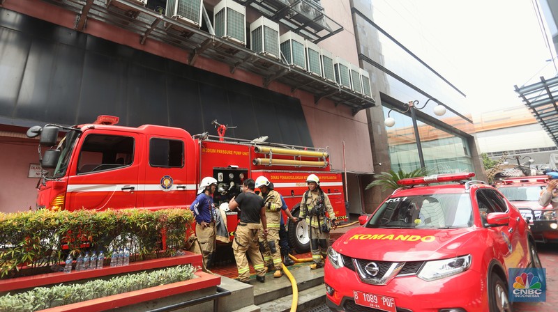 Salah satu pegawai menyebut kebakaran itu terjadi di lantai 5, di bagian belakang gedung. Namun, dia tak menjelaskan secara rinci ruangan apa yang terbakar. Selain itu, setidaknya dari pantauan, ada 4 mobil medium pressure pemadam kebakaran serta beberapa mobil light pressure. Mobil-mobil tersebut hingga saat ini masih berjaga di lokasi. (CNBC Indonesia/Andrean Kristianto)
