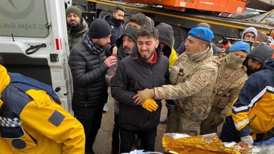 Tangisan keluarga pecah setelah keluarganya berhasil diselamatkan dari bawah reruntuhan bangunan yang menimpanya setelah gempa bumi dahsyat mengguncang. Korban tewas akibat gempa besar yang melanda Turki dan Suriah naik di atas 5.000. Angka ini diyakini akan makin bertambah seiring masih intensifnya tim investigasi mencari korban selamat yang terjebak. (Mehmet Siddik Kaya/Anadolu Agency via Getty Images)