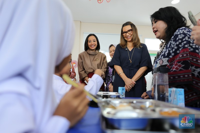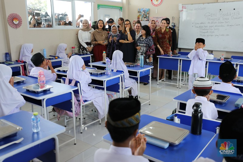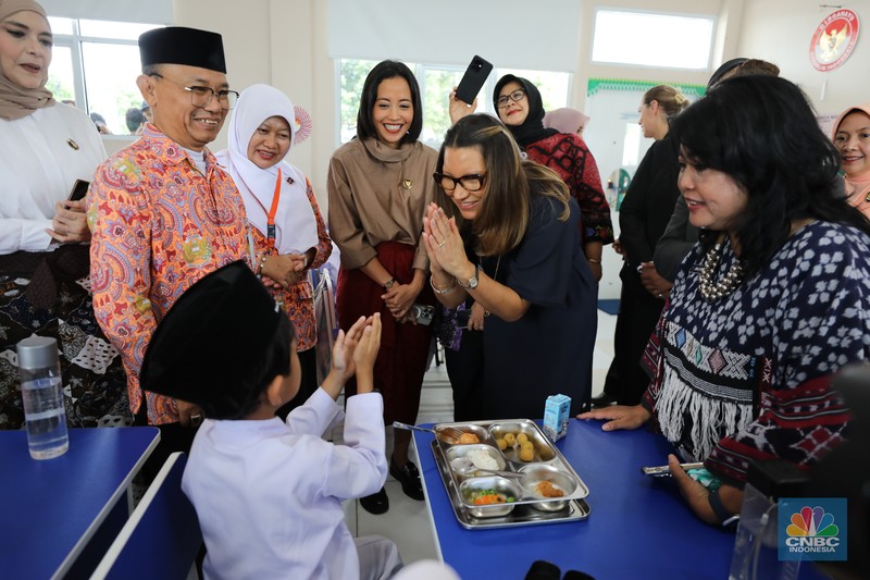 Dengan mengenakan busana setelan berwarna biru, Janja da Silva tampak antusias saat memasuki ruang-ruang sekolah untuk melihat secara langsung proses penyajian dan pelaksanaan program MBG bagi para siswa. (CNBC Indonesia/Tri Susilo)