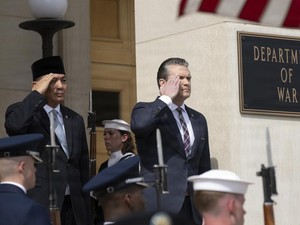 Prabowo turut menyampaikan apresiasi dan rasa terima kasih atas sambutan hangat yang diberikan di tengah padatnya agenda dari Presiden Putin. Dalam foto Prabowo terlihat berbicara dengan Putin bersama dengan Sekretaris Kabinet Teddy Indra Wijaya, Menteri Luar Negeri (Menlu) Sugiono, dan Menteri ESDM Bahlil Lahadalia.(Instagram/Sekretariat.kabinet)
