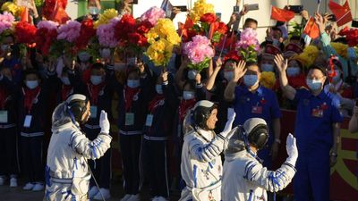 Seperti dilansir AFP, Kamis (17/6/2021), ketiga astronaut itu adalah Nie Haisheng, Liu Boming dan Tang Hongbo. Mereka akan menjalankan misi selama tiga bulan di stasiun luar angkasa tersebut. (AP/Ng Han Guan)