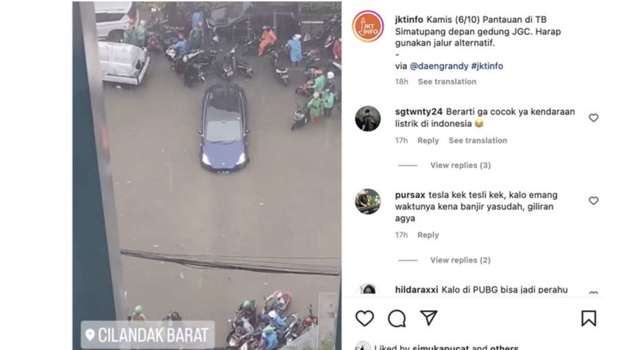 Melalui video singkat yang dibagikan akun Instagram @jktinfo, terlihat mobil listrik Tesla berkelir biru terendam hingga separuh kendaraan. Tak jelas kendaraan tersebut model apa, namun jika diperhatikan dari headlamp dan bagian atapnya, itu merupakan Tesla Model Y yang banderolnya miliaran rupiah.