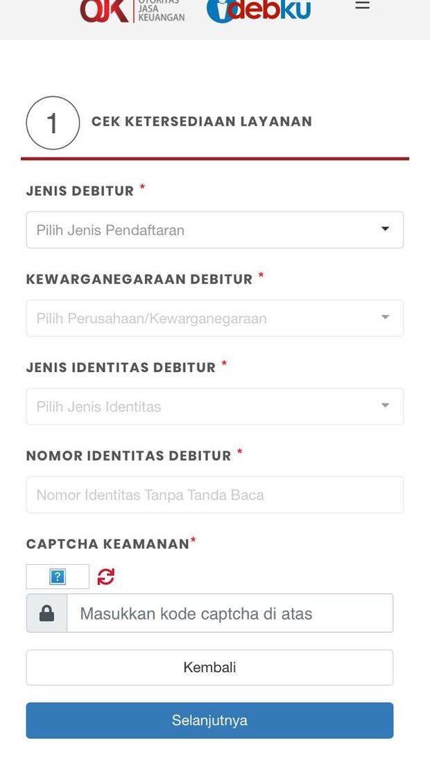 Dalam menu Cek Ketersediaan Layanan, masukkan data seperti Jenis Debitur, Kewarganegaraan, Jenis Identitas Debitur, dan Nomor Identitas yang dipilih. Jangan lupa masukkan Captcha.