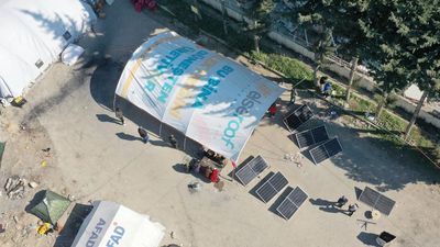 Panel Surya disediakan untuk digunakan kepada para pengungsi akibat listrik tidak tersedia sejak gempa yang mengguncang sepuluh provinsi di Turki yang meluas hingga negara tetangga Suriah berkekuatan 7,8 yang menelan korbasGemp tewas akibat gempa yang mengguncang Turki dan Suriah pekan lalu telah menembus 34.000 jiwa. (Oguz Yeter/Anadolu Agency via Getty Images)